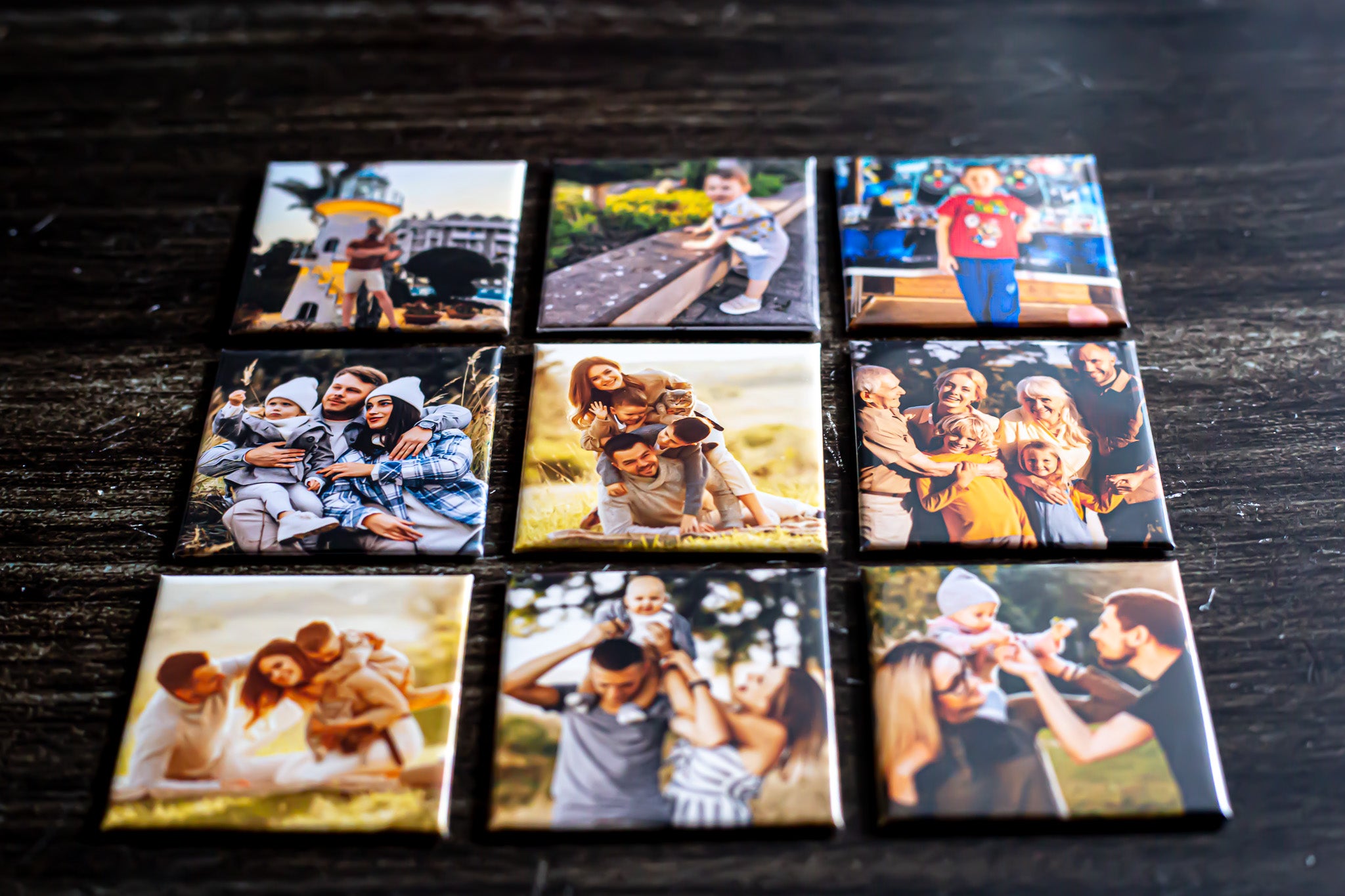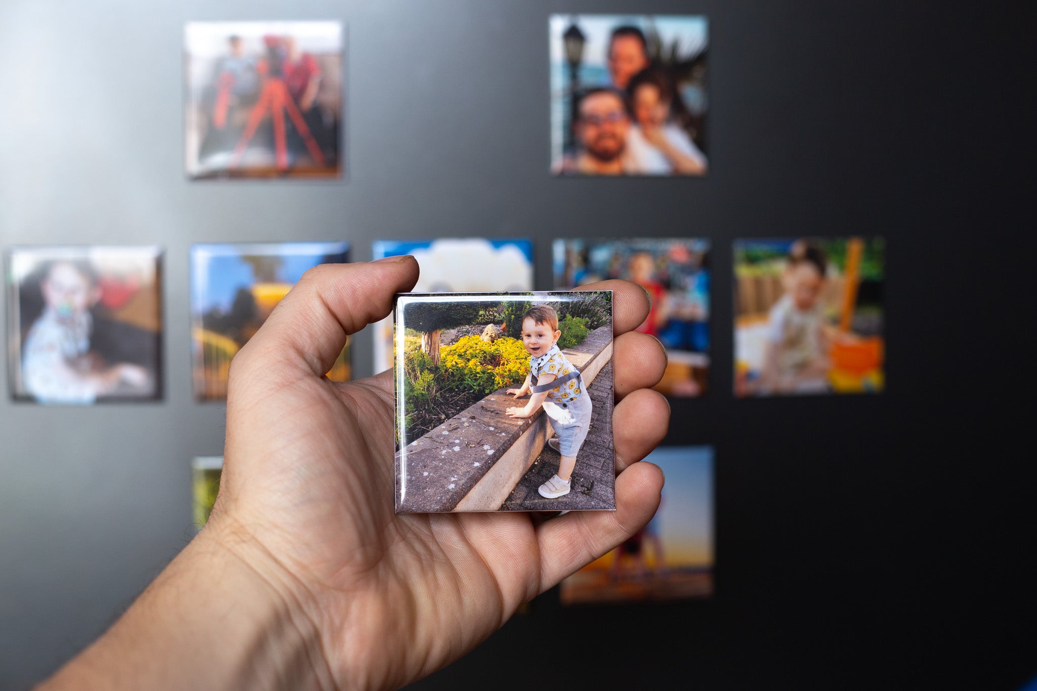 Lass deine schönsten Handyfotos als quadratische Fotomagnete drucken.